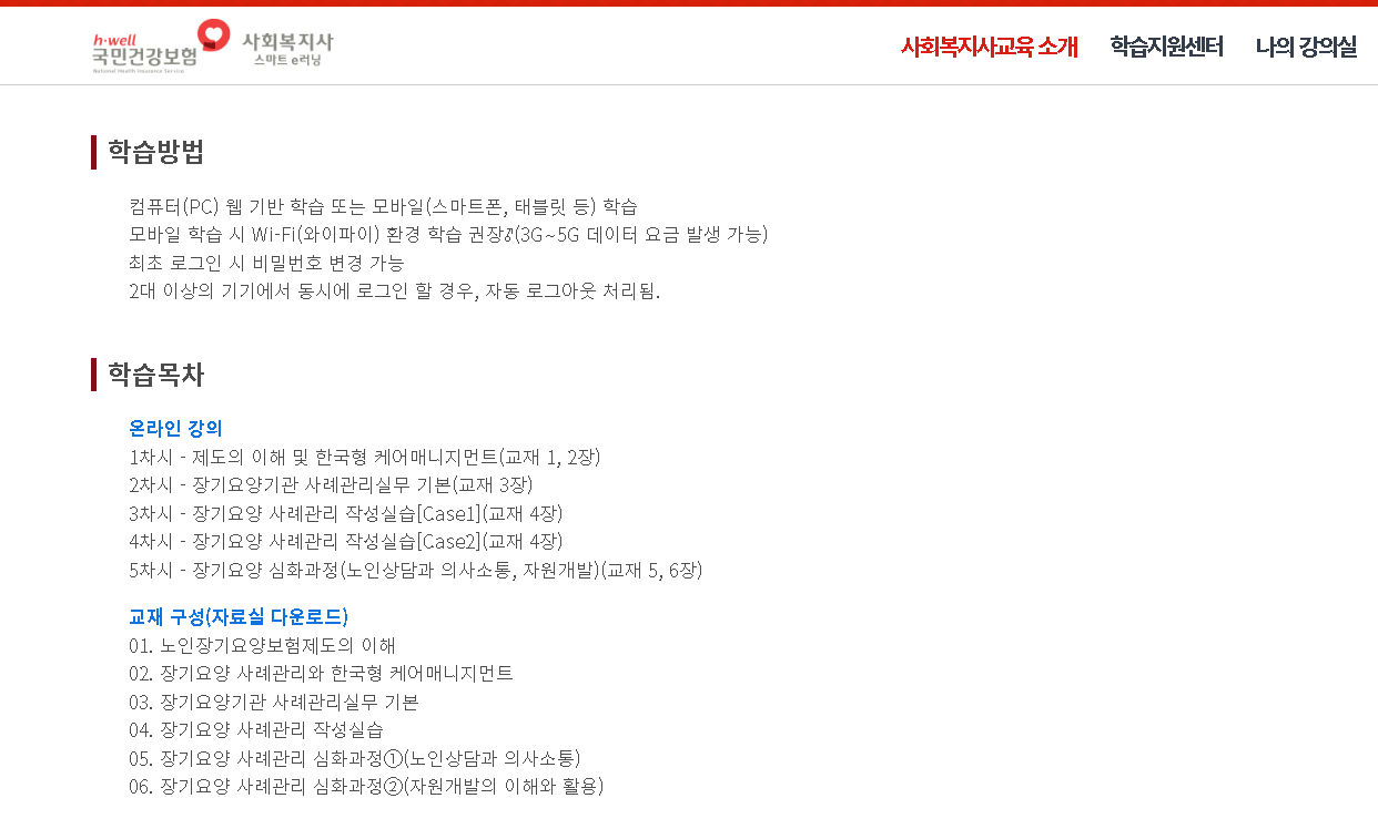 방문요양 목욕 간호기관의 사례관리 업무 수행자, 기타 사례관리 등 교육에 관심있는 장기요양기관 종사자들을 위하여 사회복지사 온라인 교육이 진행이 되어지고 있습니다.