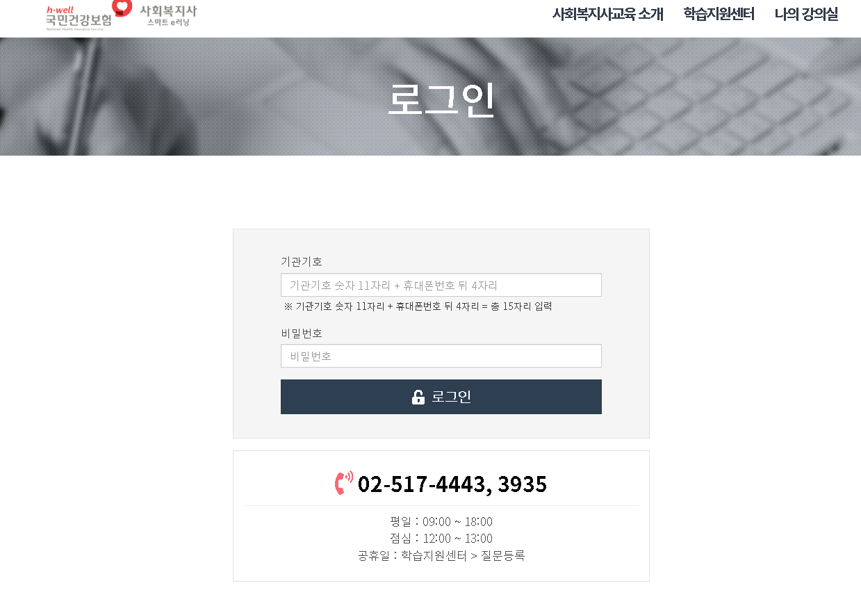 이용을 하실 때에는 기관기호를 통하여 로그인을 하신 후에 학습지원센터를 통하여 교육 수강을 진행하시면 됩니다. 문의사항은 고객센터를 통하여 확인을 하시면 되구요.