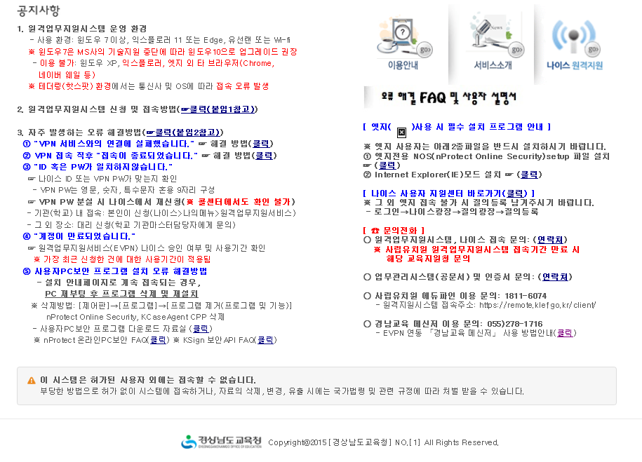 기관 이외의 온라인 환경 예를 들어 재택 파견 이동근무 등에서 업무포털, 나이스, 에듀파인, 업무관리시스템의 접속 같은 경우는 원격 업무지원 서비스 홈페이지를 이용해주셔야 합니다.
