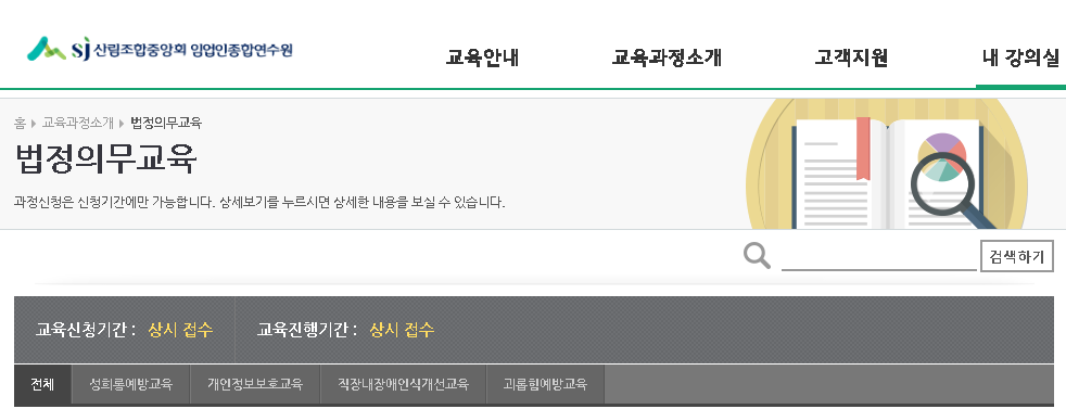 법정의무교육은 성희롱예방교육, 개인정보보호교육, 직장내장애인식개선교육, 괴롭힘예방교육이 있으며 상시 접수후 교육을 받으실 수 있다고 합니다.