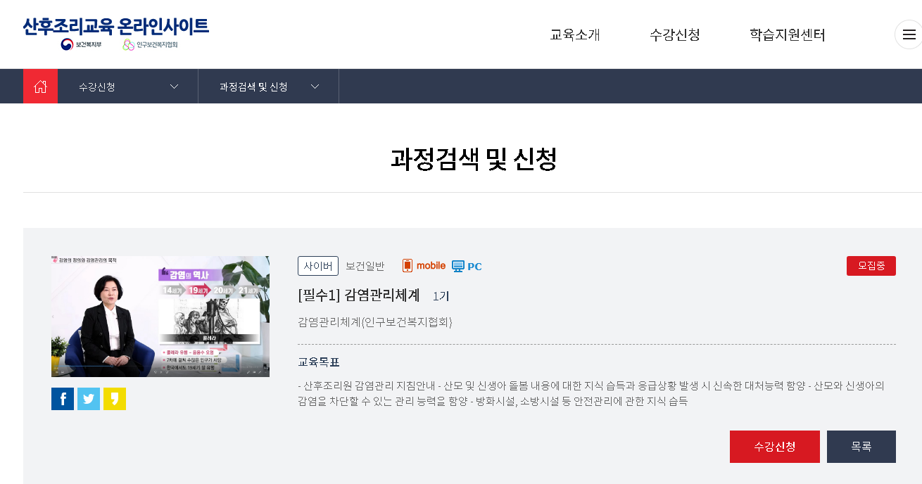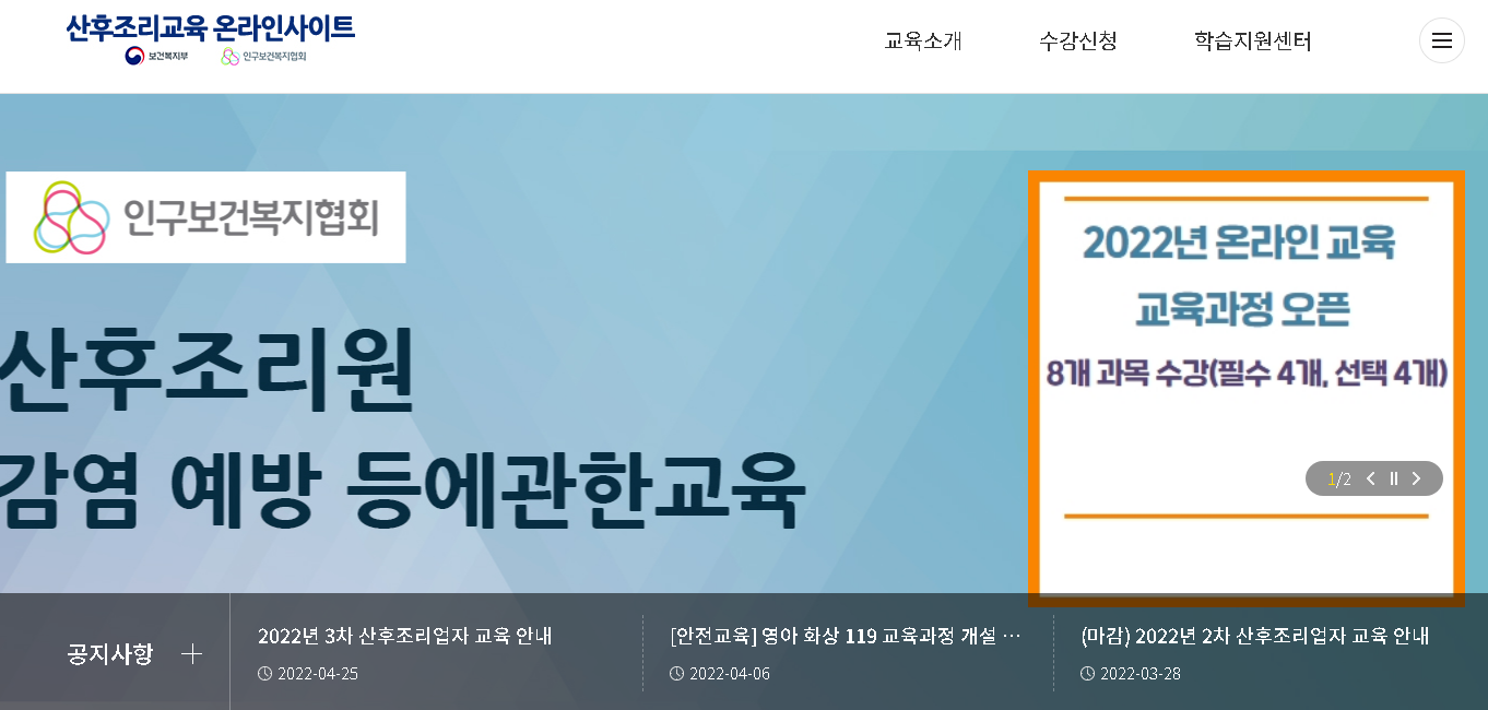 산후조리교육 홈페이지에서는 교육소개, 수강신청, 학습지원센터를 온라인으로 지원을 하고 있으니 보시고 참고를 하시면 좋을 것 같습니다.