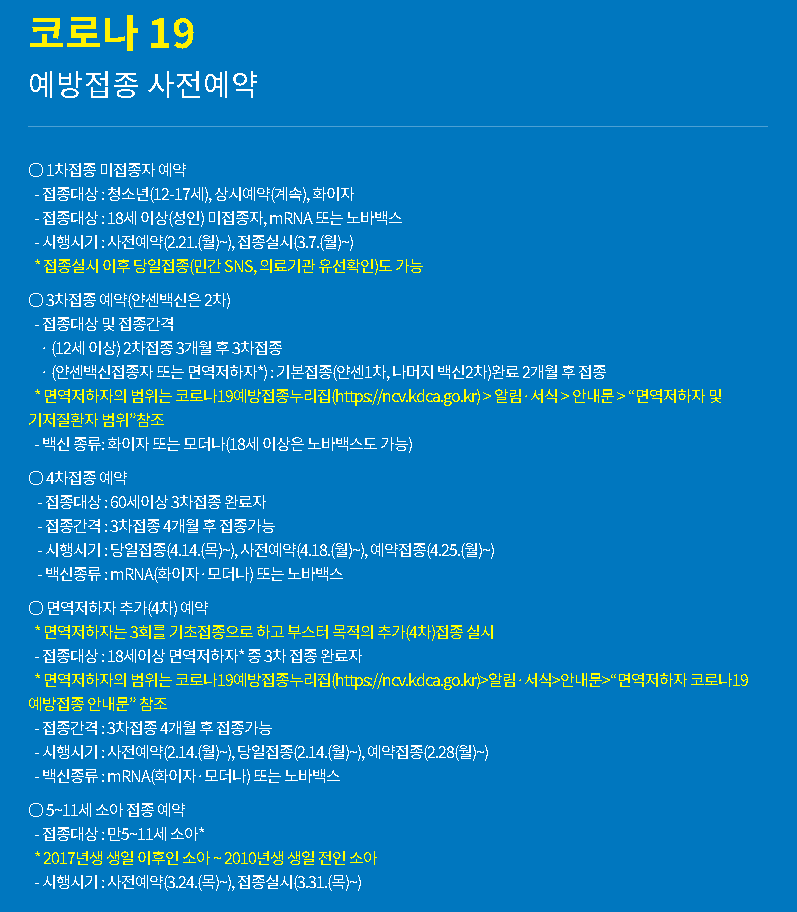 현재 1차접종 미접종자, 4차접종, 면역저하자, 5~11세 소아에 대하여 접종 예약이 진행이 되어지고 있으니 대상자분들 중에 백신접종을 원하시는 분들은 확인해보세요.