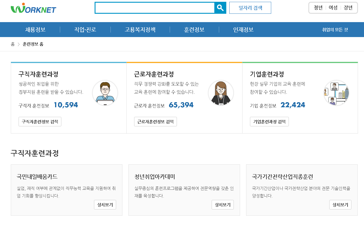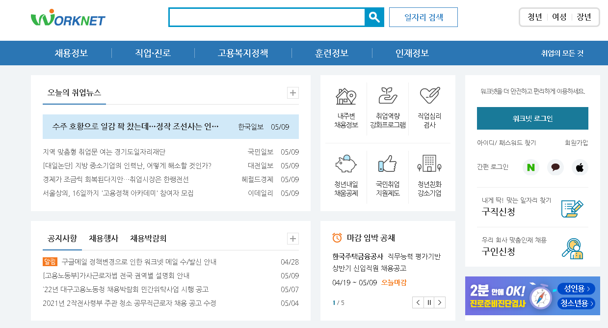 고용노동부의 고용센터를 통하여 일자리정보르 제공하는 워크넷은 구인구직을 하는 가장 대표적인 곳 입니다. 워크넷에서는 여러 채용정보 및 통합검색 그리고 직업심지검사까지 지원을 하고 있습니다.