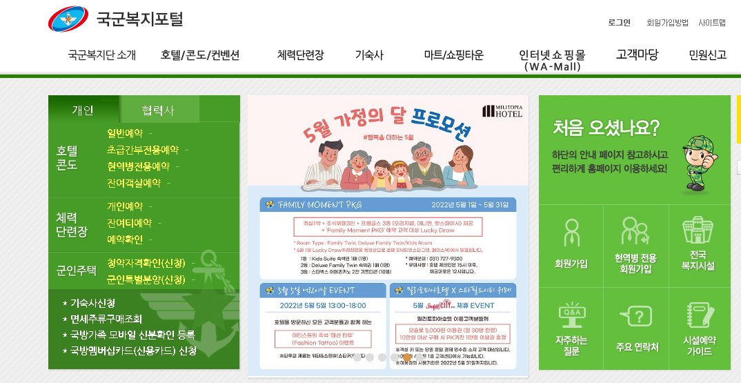 더불어 인터넷쇼핑몰 국국복지단 와몰도 운영이 되어지고 있습니다. 군인이나 군인가족, 군 관련된 국가유공자 등에게 혜택이 있으니 확인 후 이용하세요.