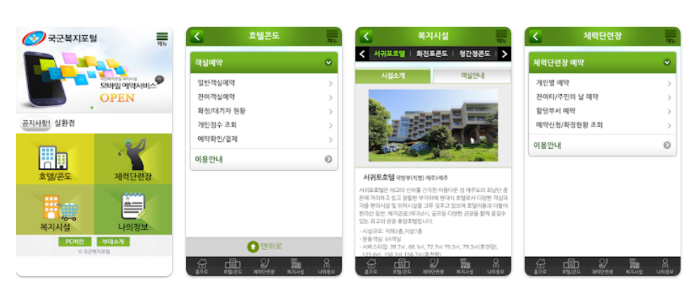각종 복지시설의 예약 및 정보확인은 온라인 국군복지단 홈페이지를 이용하여 확인을 하시면 되는데요. 모바일에서는 따로 애플리케이션도 제공되어 편리하게 보실 수 있다고 합니다.