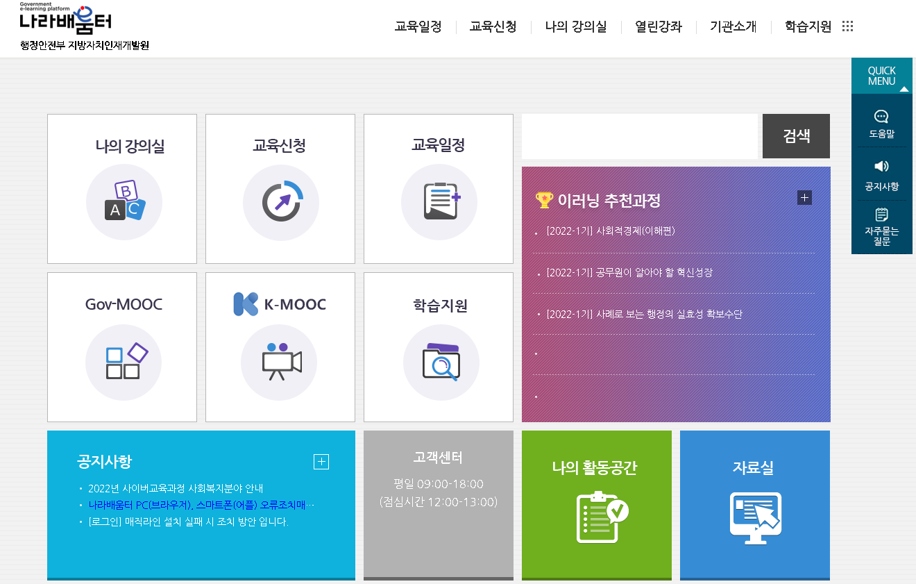 정부주관 이러닝학습센터인 나라배움터를 통하여 행정안전부 지방자치인재개밸원 사이버교육센터는 접근이 되어집니다.
