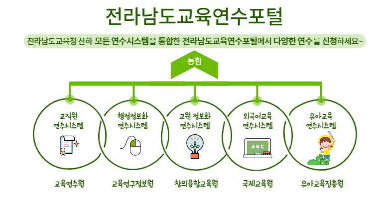전라남도에서는 전라남도 교육청의 산하 모든 연수시스템을 통합하여 다양한 연수 신청을 위하여 온라인 원격연수원을 운영하고 있습니다. 교직원 연수시스템, 행정정보화연수시스템, 교원정보화 연수시스템, 외국어교육 연수시스템, 유아교육 연수시스템 등이 통합이 되어 있습니다.