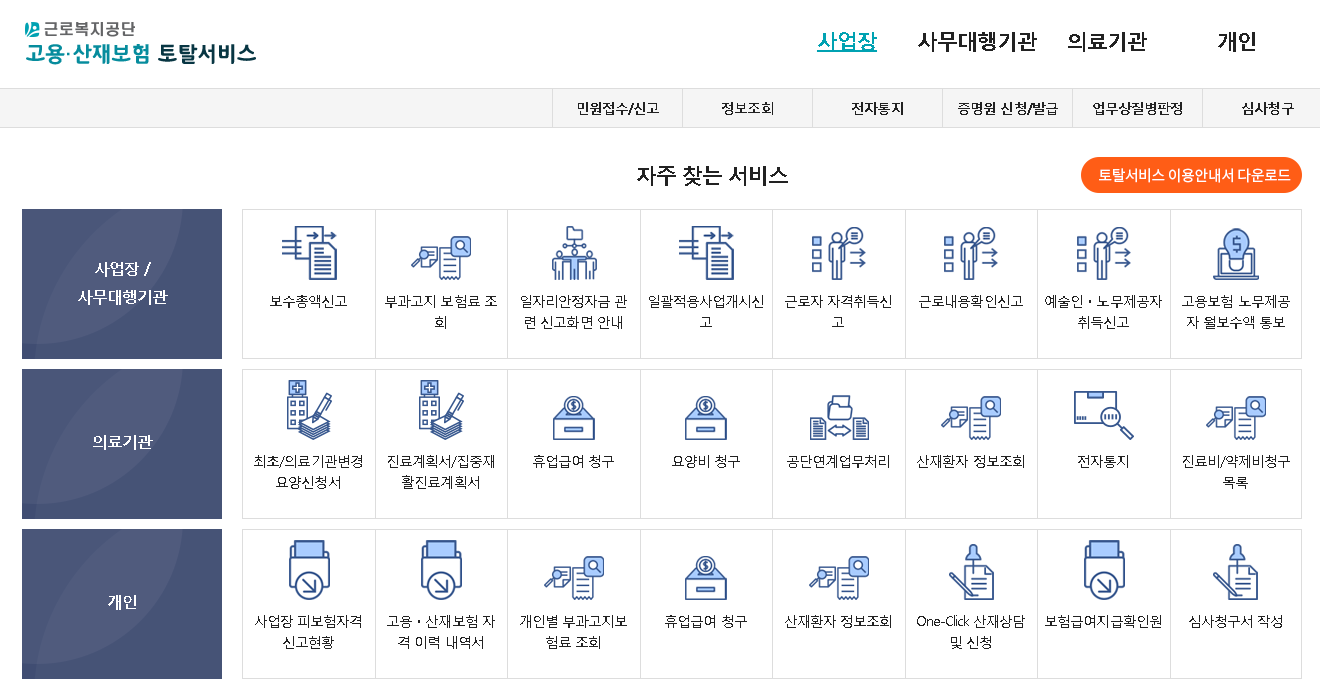 개인이나 사업장 모두 이용이 가능한 토탈서비스인데요. 이용안내서를 통하여 사용방법을 가이드 받아서 잘 사용하면 좋을 것 같습니다.
