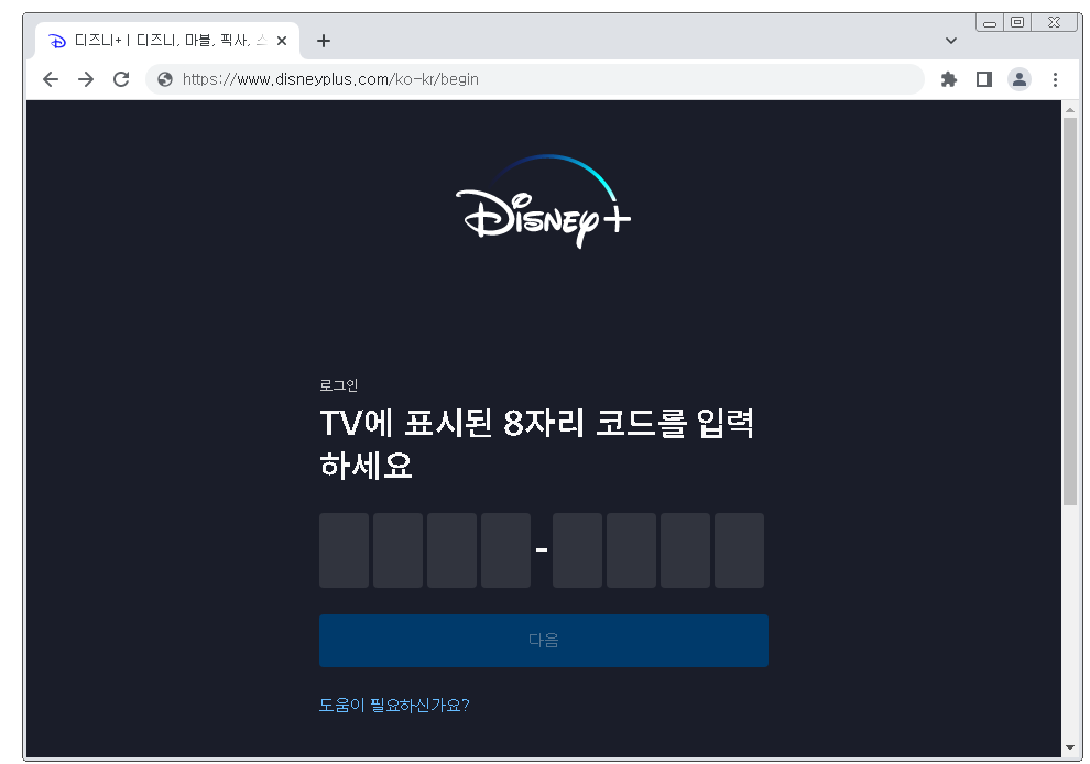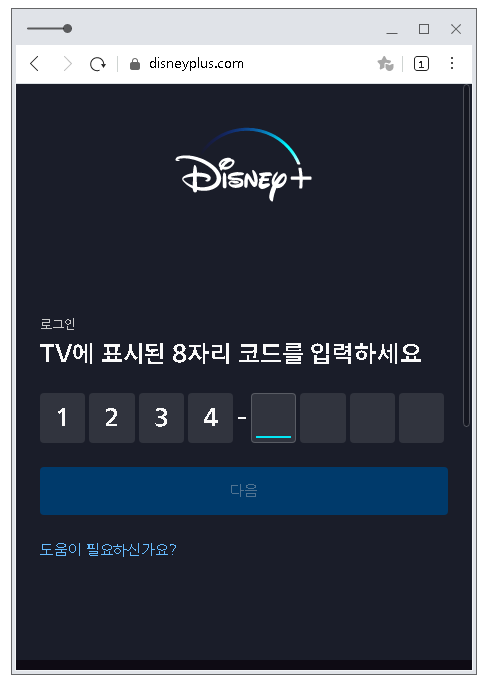 연결 주소를 통하여 들어가시면 'TV에 표시된 8자리 코드를 입력하세요'라는 메시지가 확인되구요. 여기에 코드를 넣으시면 TV와 연결하여 디즈니플러스 TV로 보기가 됩니다.