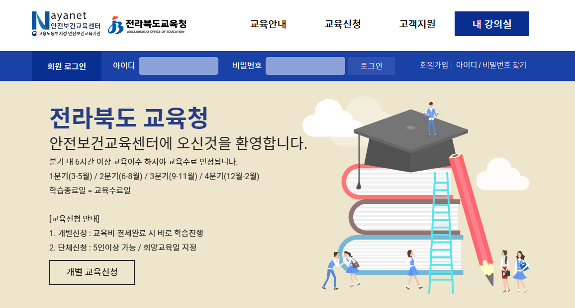 전라북도교육청에서는 안전보건교육을 위하여 나야넷을 운영하고 있습니다. 개별교육이나 단체교육에 대한 신청이나 수료증출력, 원격지원 등을 온라인으로 이용해보세요.