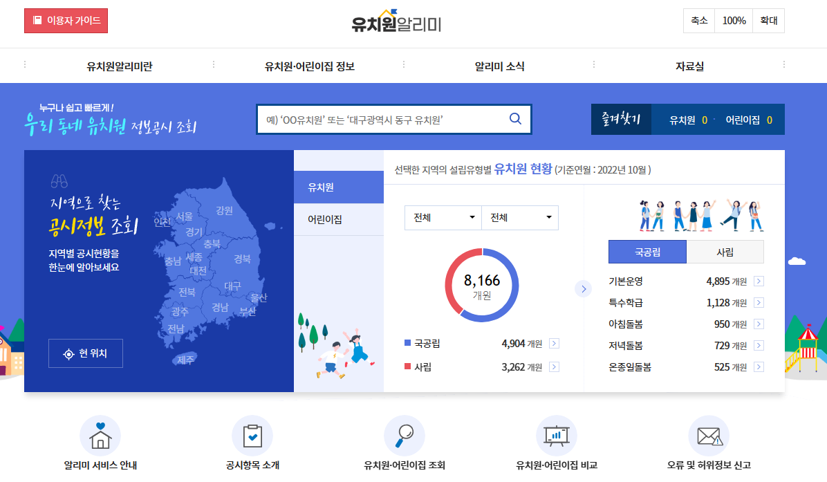 우리동네 유치원 정보공시 조회를 위하여 교육부에서는 유치원 알리미 서비스를 제공하고 있습니다. 선택한 지역의 설립유형별 유치원 현황 및 어린이집 정보 확인이 가능하다고 하니 참고해보세요.
