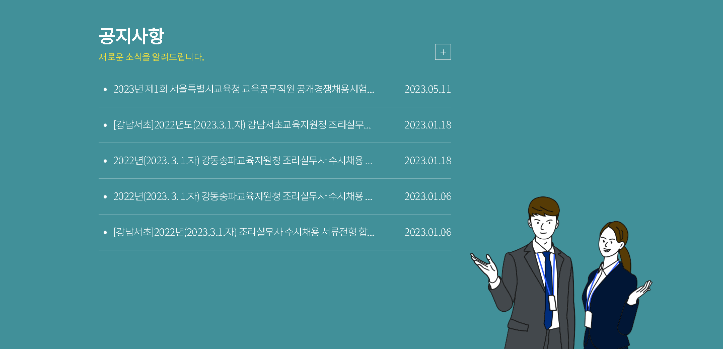 채용에 관련된 소식과 공지도 확인하실 수 있습니다. 현재 올해 진행되어지는 서울특별시교육청 교육공무직원 공개경쟁채용시험계획 공고가 확인되네요.