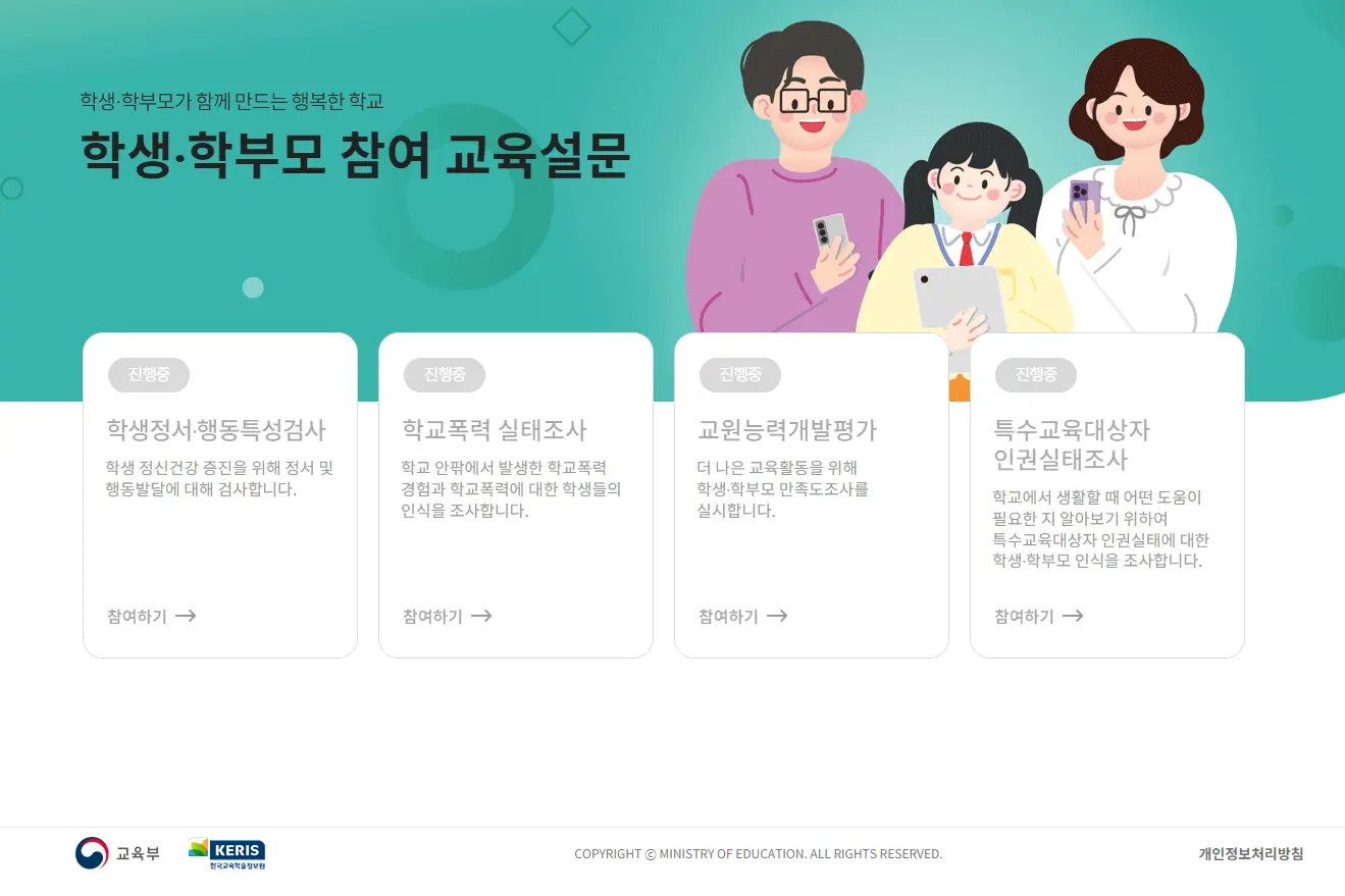 학생과 학부모가 함께 만드는 행복한 학교를 위하여 학생/학부모 참여 교육설문이 매년 진행됩니다. 2023 교원능력개발평가 학생 학부모 만족도조사 역시 곧 진행이 되어진다고 하네요. 확인하시고 교육설문 잘 진행해보시기 바랍니다.