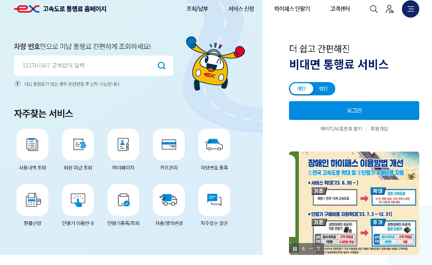 고속도로를 이용한 차량의 통행료를 조회하거나 납부할 수 있도록 고속도로 통행료 홈페이지가 제공됩니다. 하이패스 서비스 통합 사이트라고 불리기도 하는 이곳의 다양한 서비스 온라인으로 접속하여 간편하게 이용하세요.