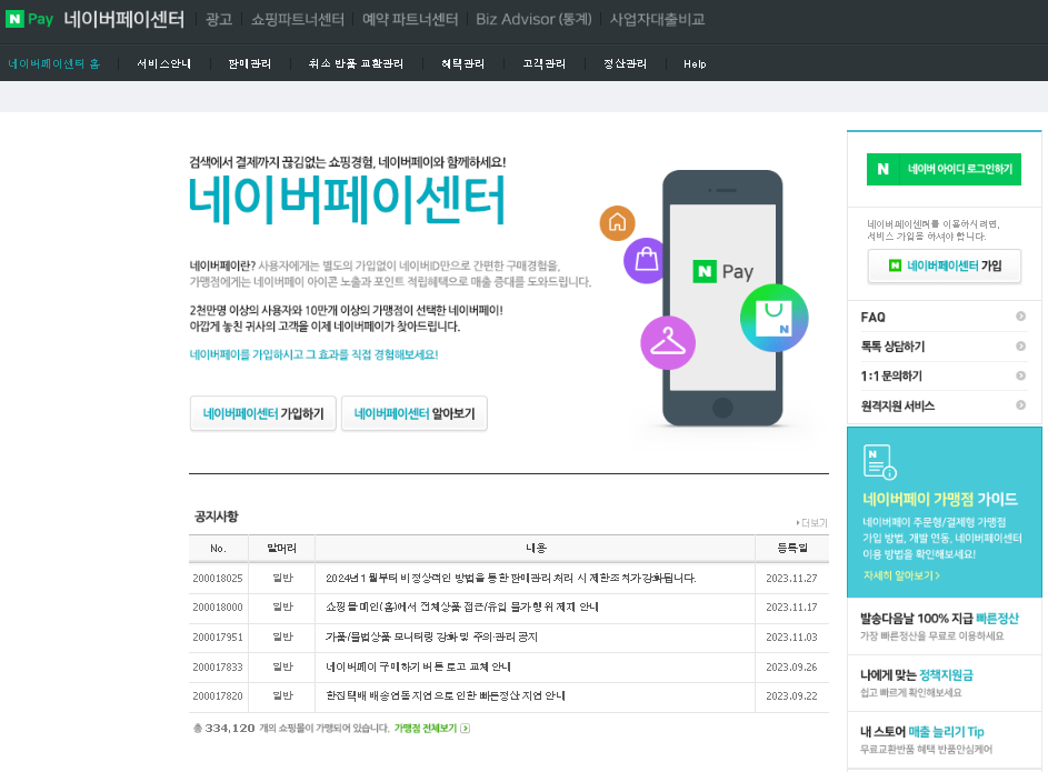 네이버페이 판매자센터는 네이버페이 가맹 판매자들이 결제, 정산, 고객 관리 등의 업무를 처리할 수 있도록 지원하고 있습니다. 네이버페이센터 가입 및 가맹점 가이드를 잘 확인하시고 이용하시길 바랍니다.