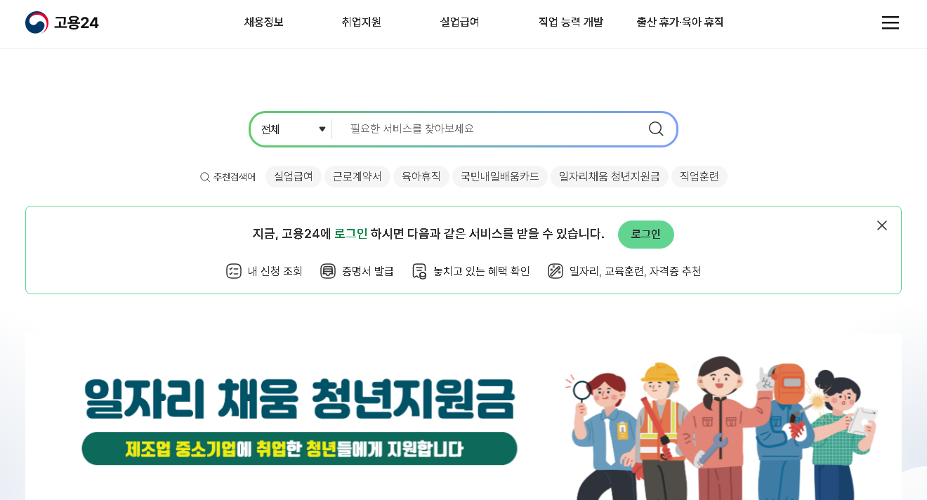 통합된 시스템을 통하여 고용24에서는 구인구직, 실업급여, 내일배움카드, 육아휴직 등에 관련된 서비스의 이용이 가능합니다.