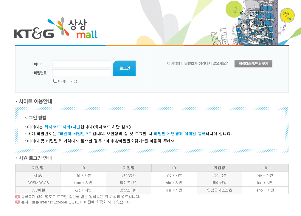 기업명 ID 기업명 ID 기업명 ID KT&G ktg + 사번 인삼공사 kgc + 사번 영진약품 yjp + 사번 COSMOCOS smc + 사번 라이프앤진 gin + 사번 태아산업 tae + 사번 KGC예본 kyb + 사번 상상스테이 ssi + 사번 인삼공사스포