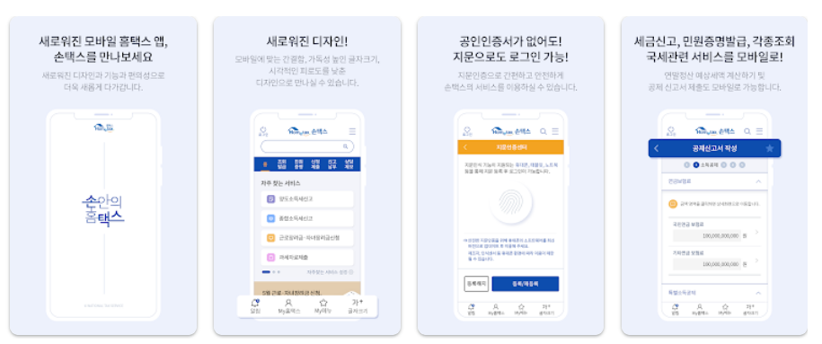 이러한 손택스는 웹보다는 전용 앱을 이용하시면 편리하게 이용이 가능한데요. 안드로이드 및 ios 모두 스토어에서 받을 수 있도록 제공되어지기 때문에 설치를 하시고 사용을 하시는 것을 권장합니다.