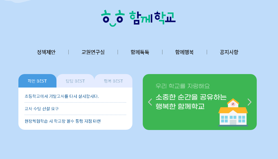함께학교는 교육 정책에 대한 참여를 높이고 교육 현장의 목소리를 정책에 반영하기 위한 좋은 수단입니다. 실제도 개통 이후 많은 학생, 학부모, 교사들이 참여하여 활발한 소통을 이어오고 있다고 합니다. 그럼 함께학교 온라인 홈페이지와 앱을 통하여 편리하게 접속하여 이용해보시기 바랍니다.