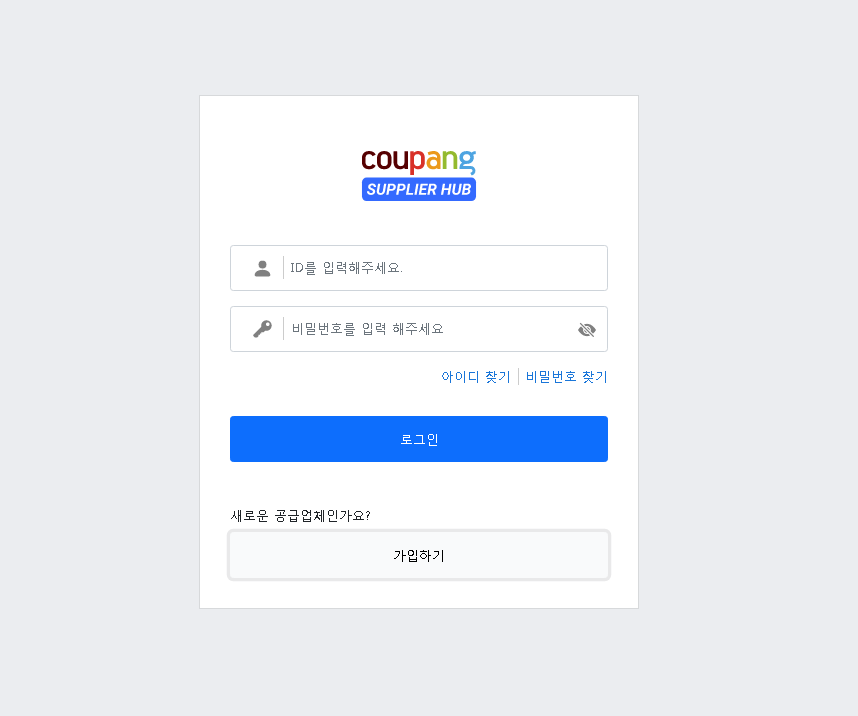 쿠팡 서플라이어 허브 로그인을 위해서는 공급업체 가입부터 진행하셔야 합니다. 가입후에는 로그인을 하시고 접속하셔야 이용이 가능합니다. 만일 ID와 비밀번호를 잃어버리셨다면 찾기를 통해 확인하시고 로그인을 하시면 됩니다. 그럼 쿠팡 서플라이어 허브 잘 활용하여 제품 판매하시는데 많은 도움 받으시기 바랍니다.