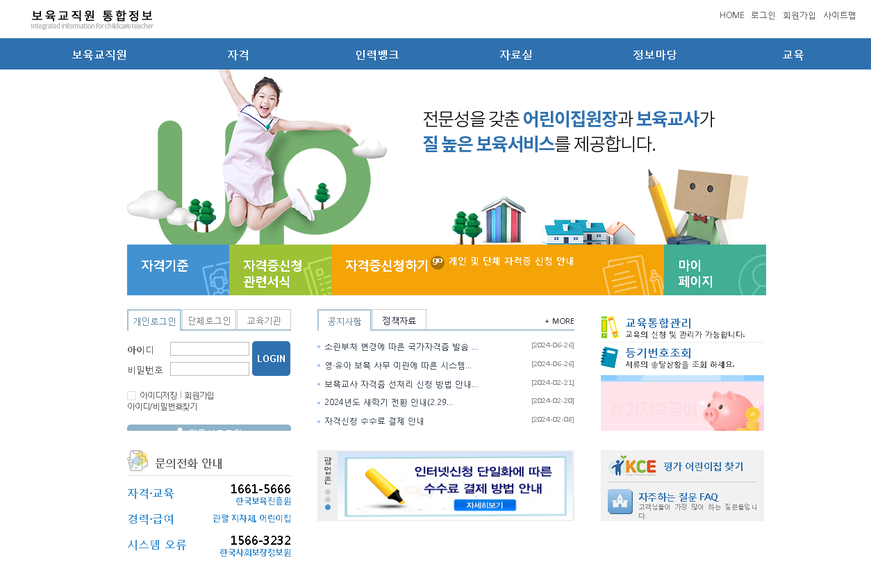 한국보육진흥원에서는 보육교사 및 어린이집 원장이 되기 위한 자격기준, 자격증 신청 관련 서식, 자격증 신청 방법 등을 안내하기 위해 보육교직원 통합정보 사이트를 운영하고 있습니다.