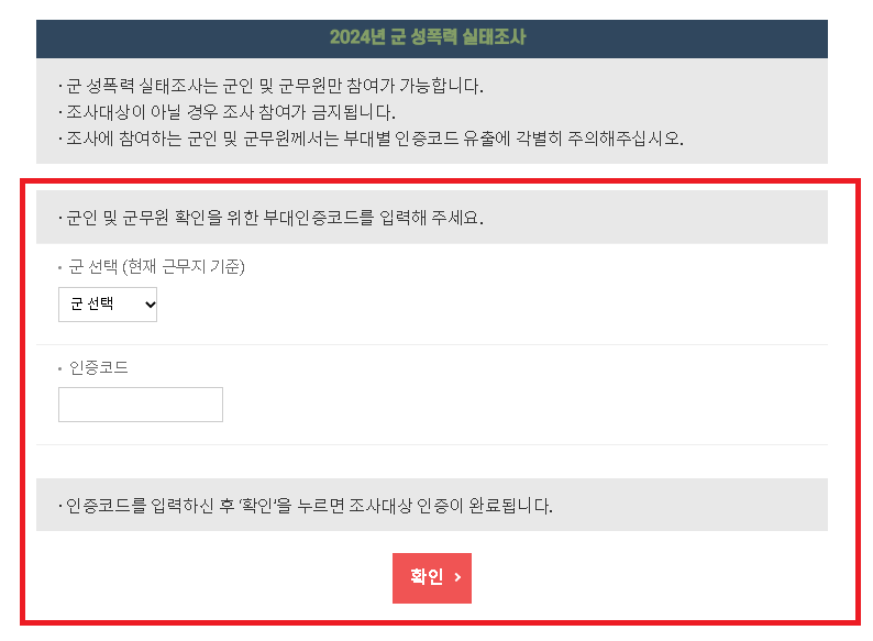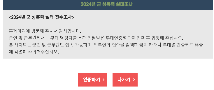 군인 및 군무원들은 2024년 군 선폭력 실태 전수조사를 갤럽을 통해 진행하실 수 있습니다. 부대 담당자를 통해 전달받은 부대인증코드를 입력 후 접속하여 조사에 성실하게 참여하시기 바랍니다.