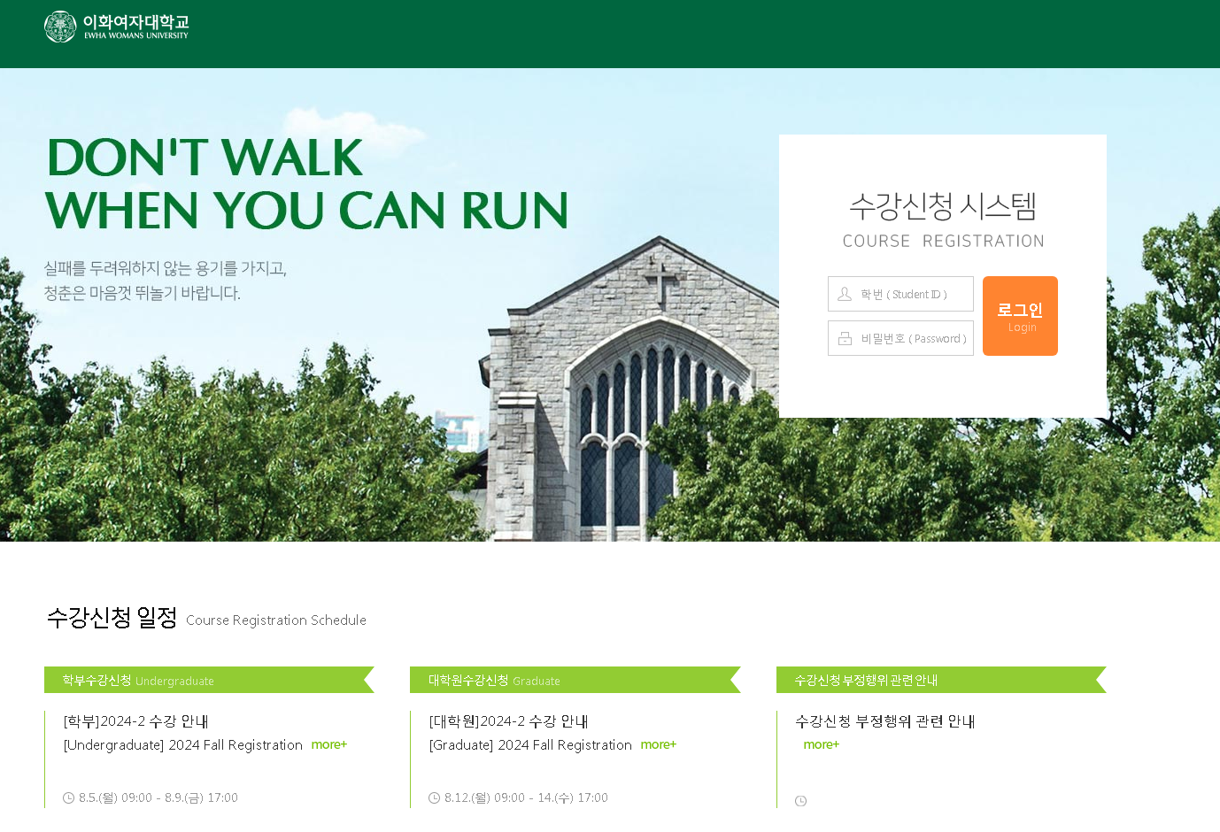 이화여대에서는 온라인으로 수강신청을 할 수 있는 시스템을 제공하고 있습니다. 학부 및 대학원생분들은 수강신청 일정확인하시고 시간표대로 수강완료하시기 바랍니다.