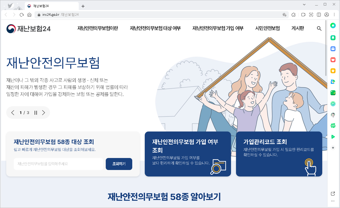 재난이나 사고로 인한 피해를 보상하기 위해 법률에 따라 가입이 강제되는 재난안전의무보험에 대해 확인하실 수 있는 재난보험24 홈페이지가 운영되고 있습니다. 이를 통해 가입 여부 조회 및 다양한 정보 확인하시기 바랍니다.
