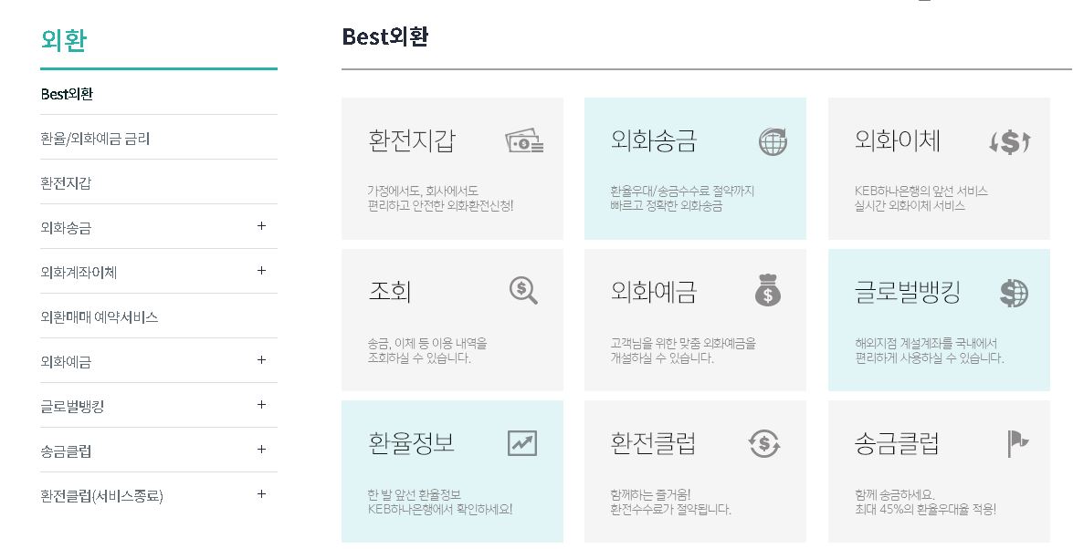하나은행 역시 외환은행을 이어받아서 그런지 외환 관련 서비스가 다른 곳들보다 잘되어 있는 것 같은데요. 덕분에 인터넷뱅킹 홈페이지를 이용하여 서비스를 지원받기에 좋은 것 같습니다.