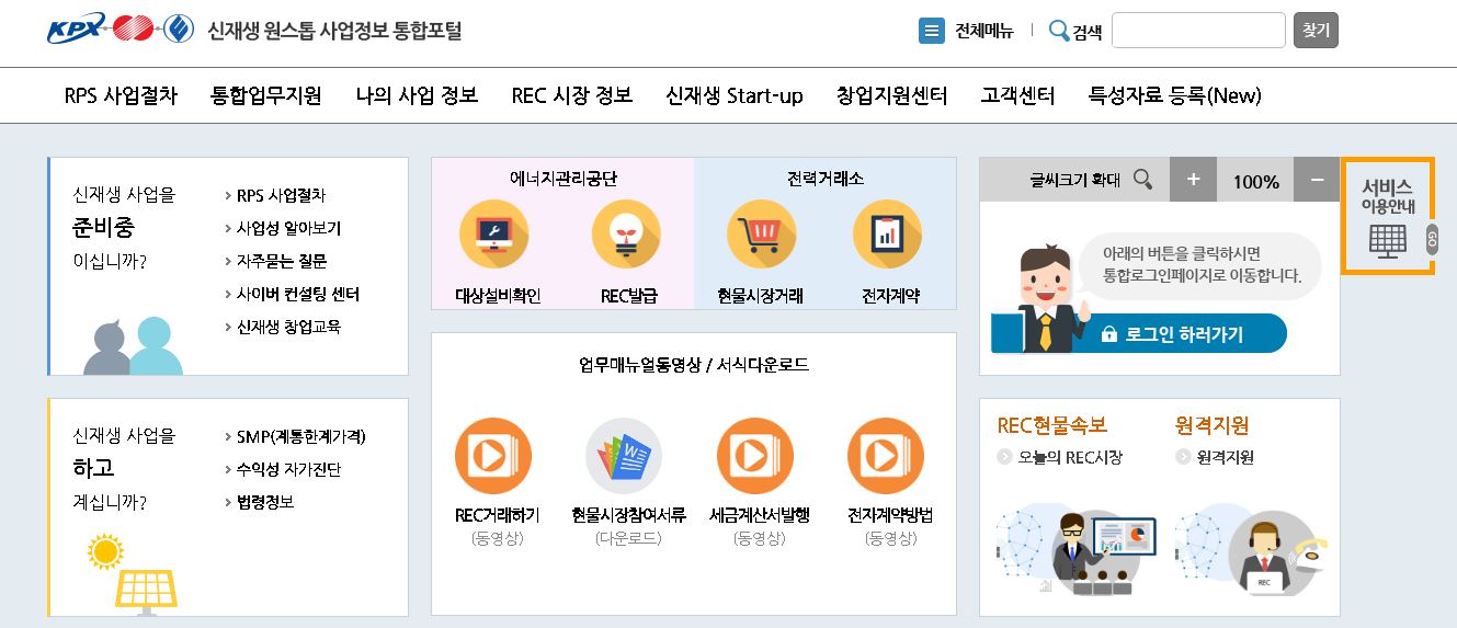 전력거래소에서는 신재생발전사업자들의 원할한 REC거래를 위하여 신재생 원스톱 사업정보 통합포털 홈페이지 서비스를 이용하고 있습니다.