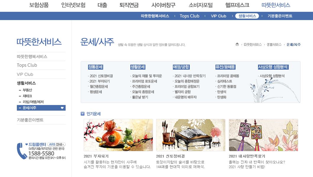 운세서비스는 신한생명 홈페이지에서 따뜻한서비스 -> 생활서비스 -> 운세/사주를 통해 확인을 하시면 됩니다. 이곳을 바탕으로 신토정비결, 부자되기, 퓨전/꿈해몽, 사상오행 성향분석 등이 가능합니다.