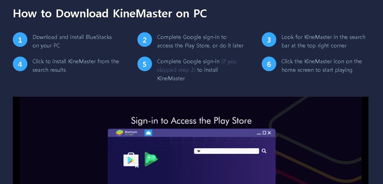 다음으로 앱플레이어 실행을 하신 이후에 구글 계정으로 로그인 후 구글 플레이 스토어에서 키네마스터 앱을 다운로드 받으시면 됩니다. 그러면 모바일에서 사용을 하시던 앱을 앱 플레이어를 통해 컴퓨터에서도 이용이 가능합니다.