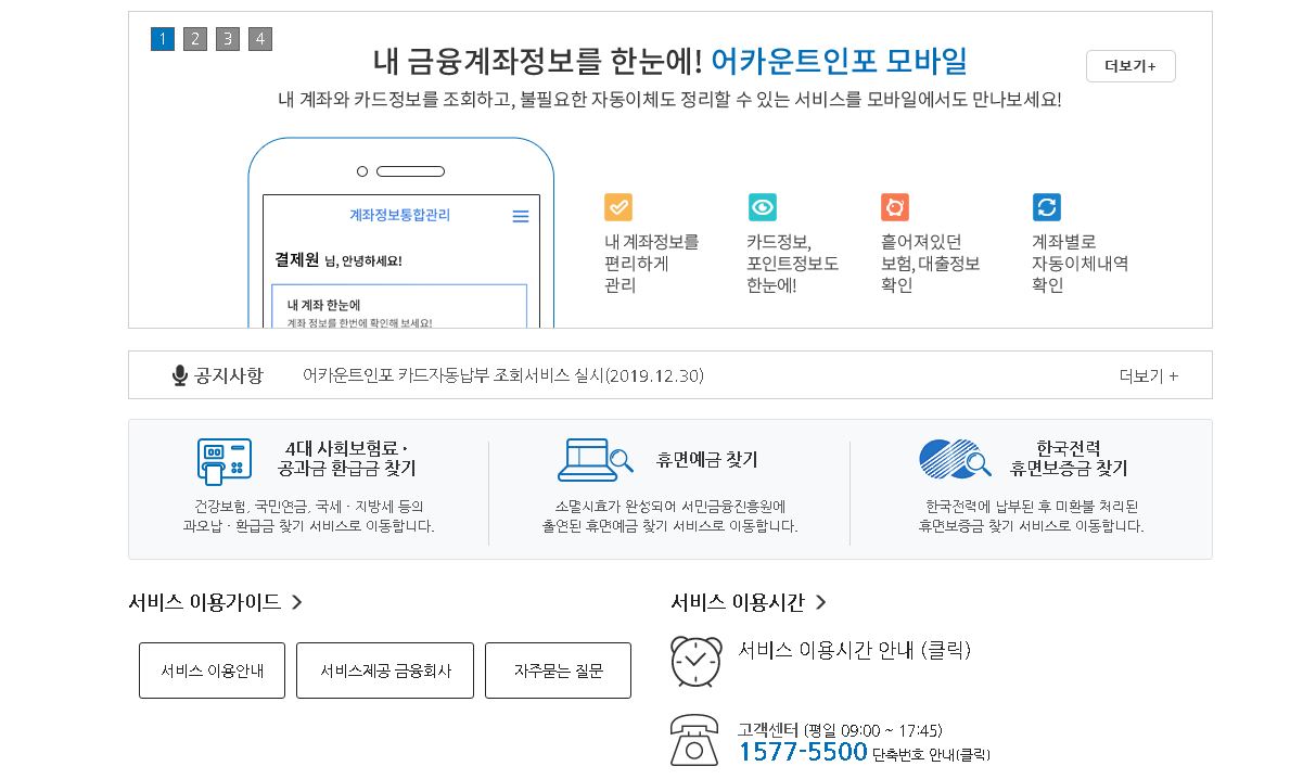 흩어져 있는 금융회사에 등록이 되어져 있는 정보를 쉽게 조회할 수 있는 서비스가 온라인으로 제공이 되어지는데요. 내 계좌와 내 카드를 한눈에 보실 수 있는 곳으로써 계좌정보통합관리서비스로 운영이 되어집니다. 이런 내 예금 찾아줌 홈페이지는 어카운트인포 사이트로써 온라인 홈페이지와 모바일 애플리케이션으로 접속이 되어지는데요.