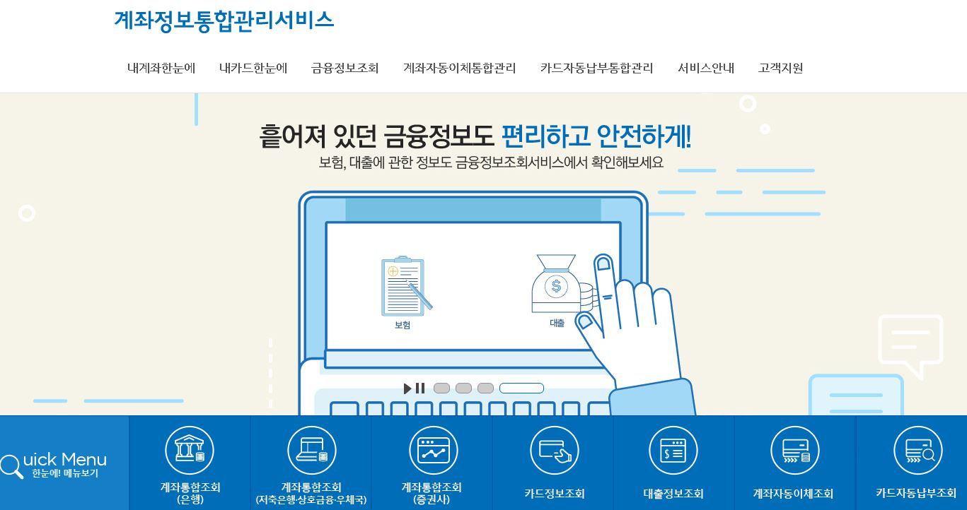 들어가셔서 인증과정을 거치시면 편리하게 금융정보조회서비스를 이용 가능합니다. 더불어 자동이체관리시스템도 제공하여 자동이체가 어떻게 되어지고 있는지 여부 역시 통합하여 볼 수 있어서 편리합니다.
