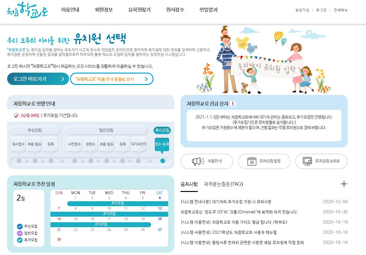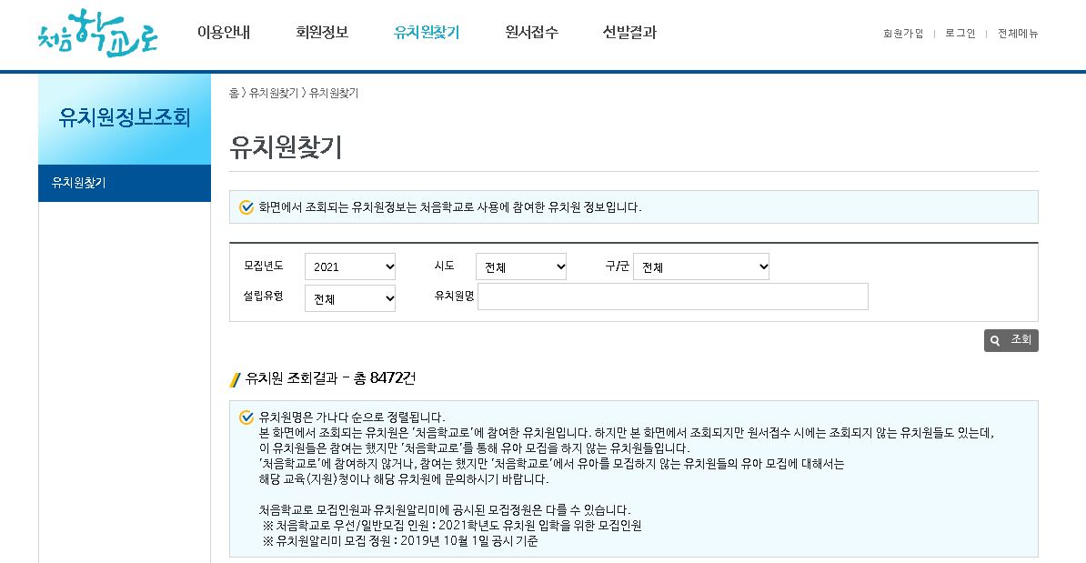 시스템에 등록이 된 관래의 공/사립 유치원을 대상으로 검색을 하시고 모집 접수를 진행하여 선발이 되어지는 처음학교로인데요. 공정하게 선발된 결과를 알려줌으로써 서로간의 불편 해소를 해준다고 합니다.