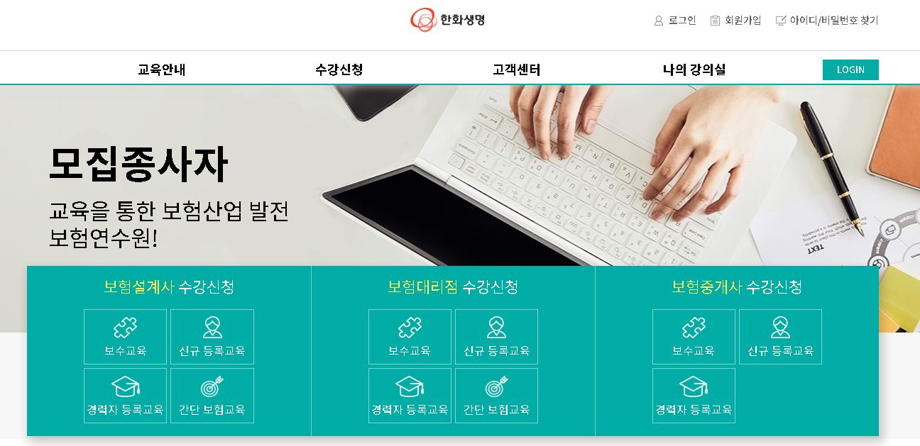 교육센터에서는 한화생명보험연수원수강신청을 비롯하여 보험설계사, 보험대리점, 보험중개사에 대한 보수교육, 신규 등록교육, 경력자 등록교육을 신청하실 수 있습니다.