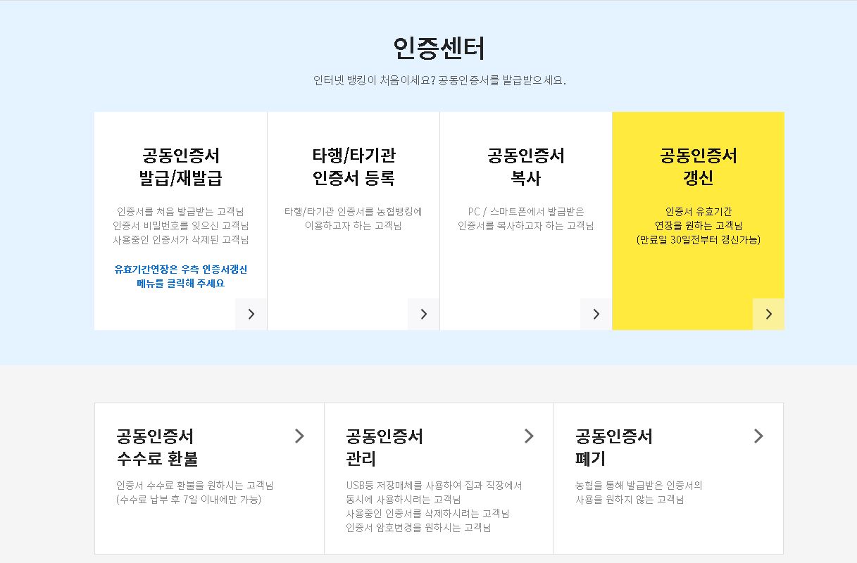 이런 농협은행의 개인인터넷뱅킹 같은 경우는 NH농협은행 인터넷뱅킹 홈페이지나 스마트뱅킹 애플리케이션을 이용하시면 가능합니다. 인증센터를 이용하여 공동인증서나 금융인증서를 발급을 받으시고 로그인을 하신 이후에 이용을 하시면 되는데요.