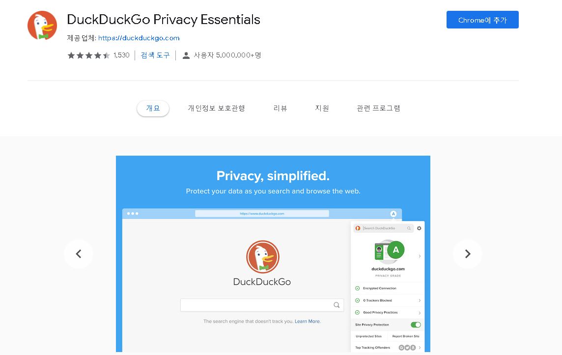 비공개 검색 및 추적차단 그리고 사이트 암호화를 지원하고 있구요. 크롬용 덕덕고 확장 기능 추가를 진행 가능하여 Chrome 확장 프로그램으로도 사용이 가능하다고 합니다.