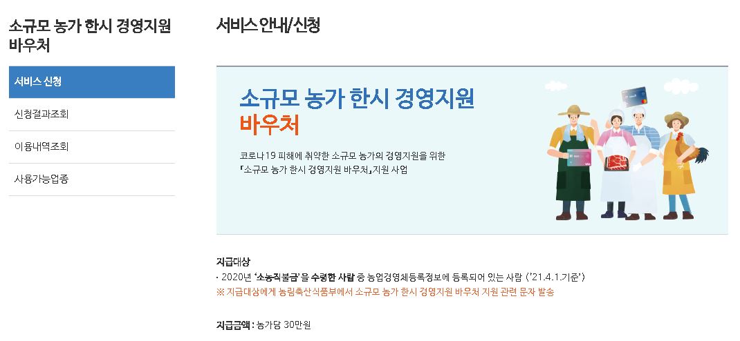 4차 재난지원금으로 농업분야를 지원하기 위하여 코로나 극복 영농지원 바우처, 소규모 농가 한시 경영지원 바우처가 시행이 되어집니다. 20년 소규모 농가 직접지불금을 수령한 사람들 중에서 현재 농업경영체에 등록정보에 등록이 되어 있거나 20년 소농직불금 수령농가의 구성원이 현재 농업경영체등록정보에 경영주로 등록이 되어 있다면 지급대상에 포함이 되어진다고 합니다.