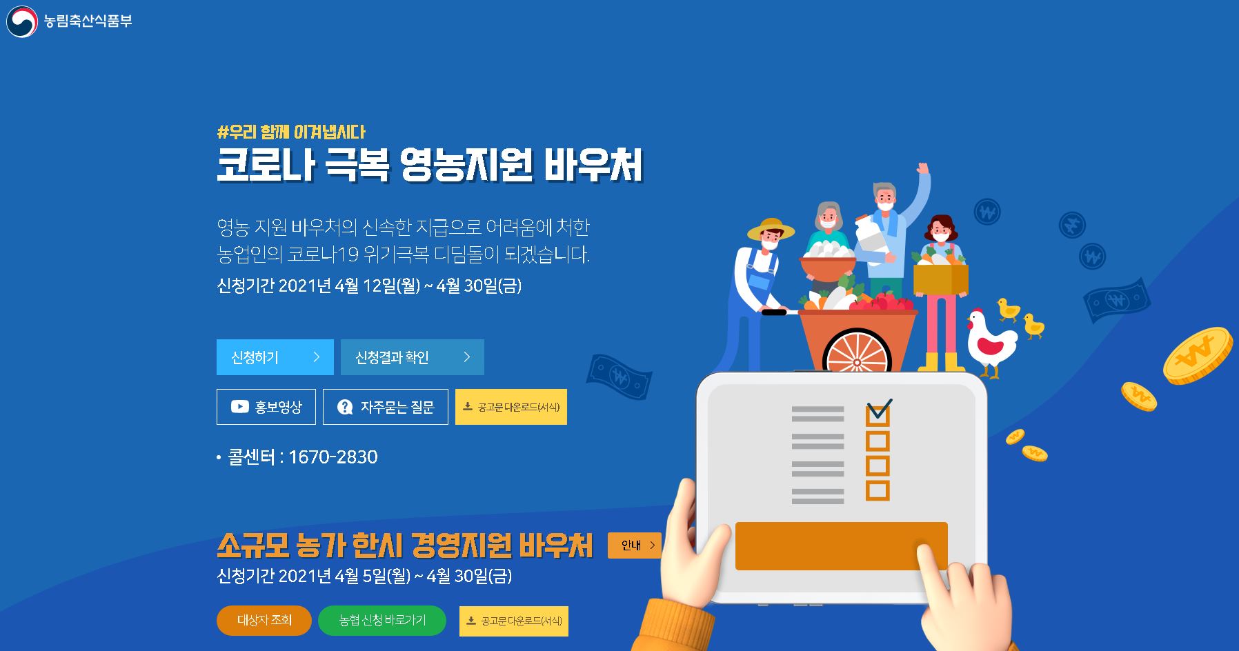 소규모농가 한시 경영지원 바우처와 코로나 극복 영농지원 바우처는 따로 진행이 되어지는 것 같으니 대상자인지 확인을 하시고 신청 마쳐주시길 바랍니다.