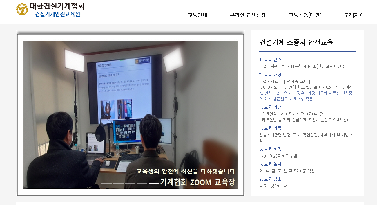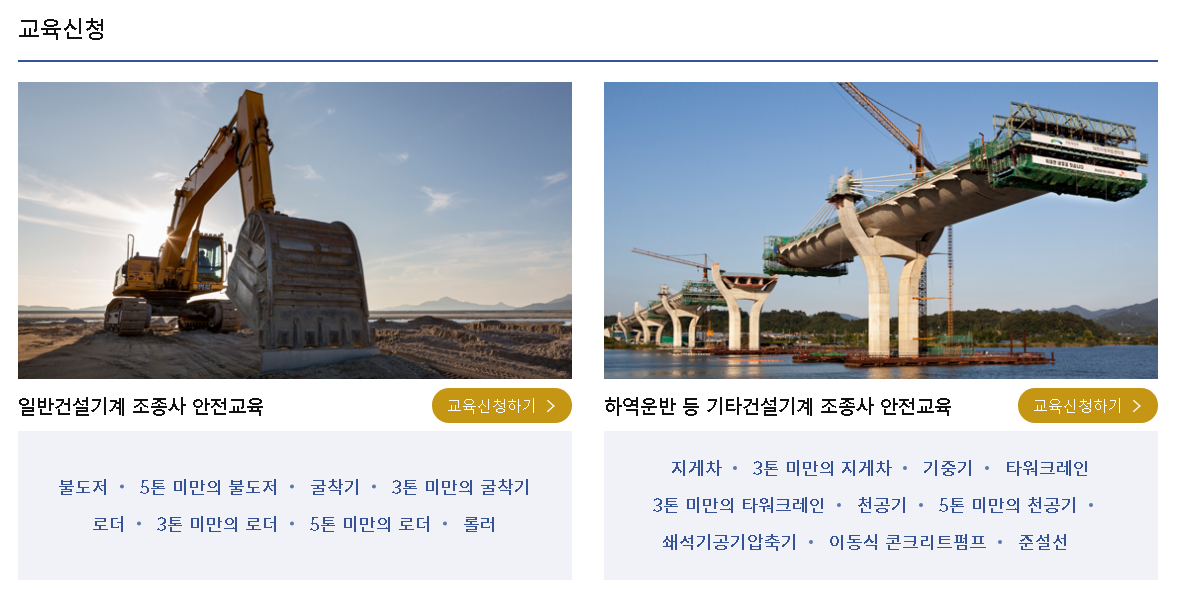 교육은 일반건설기계조종사 안전교육 및 하역운반 등 기타 건설기계 조종사 안전교육을 진행합니다. 건설기계관련 법령, 구조, 작업안전, 재해사례 및 예방대책 역시 확인됩니다.
