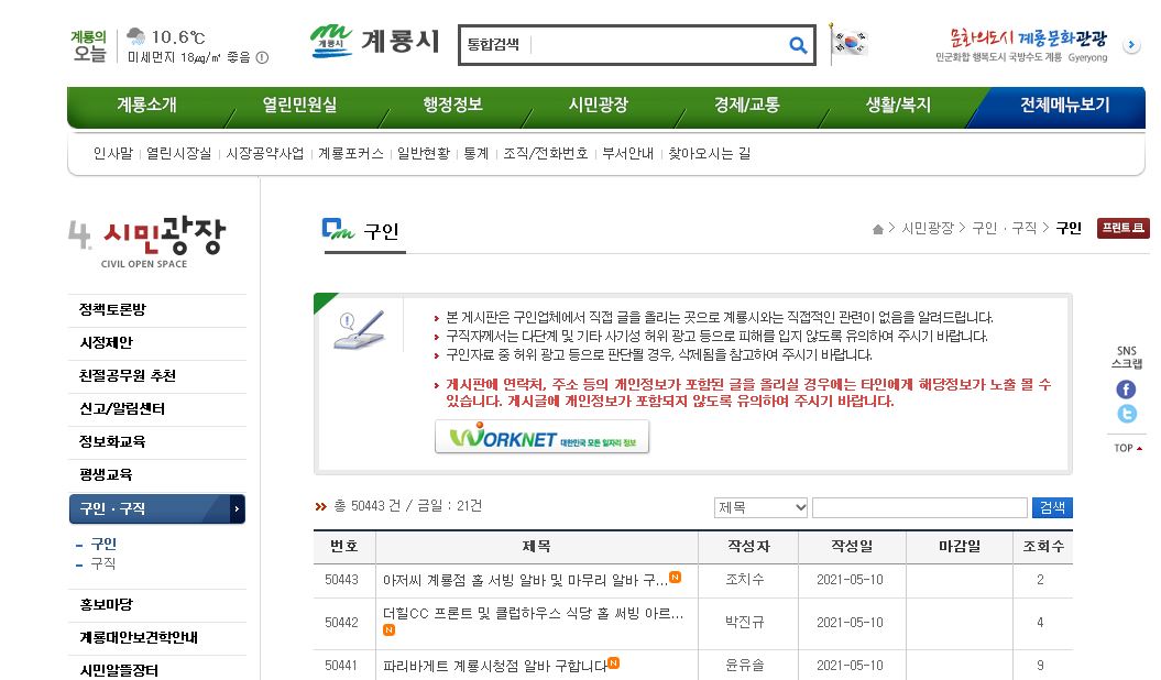 계룡시청의 구인구직은 홈페이지의 시민광장에서 확인이 가능하구요. 로그인이 없어도 관련된 글을 보실 수 있기 때문에 편리합니다.