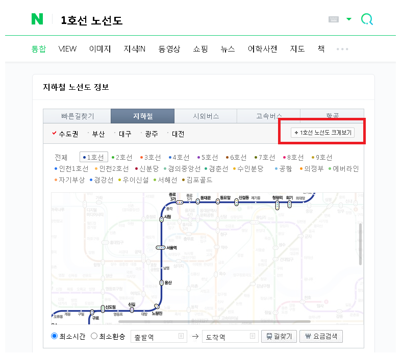 이용방법은 네이버에서 '1호선 노선도'를 찾아서 1호선 노선도 크게보기로 들어가 주시면 됩니다. 이렇게 하시면 현재 서울 지하철의 1호선 노선도를 온라인으로 크게 확인 가능합니다.