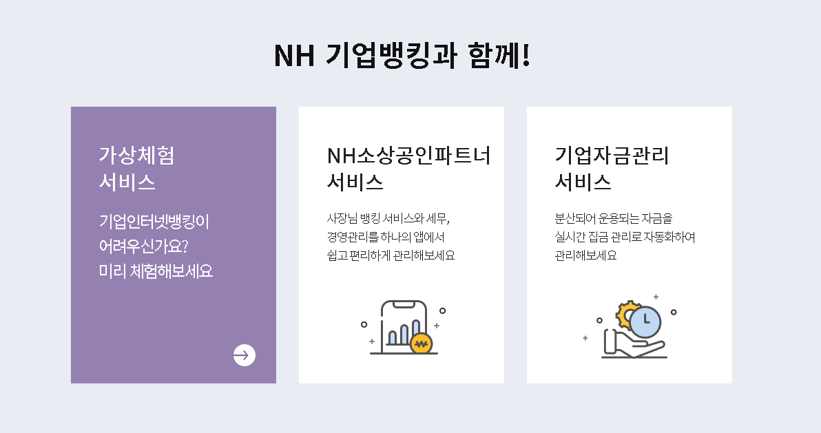 이러한 점은 농협 개인뱅킹 뿐아니라 농협 기업뱅킹 부분에서도 그런데요. 회사에서도 농협기업인터넷뱅킹바로가기를 하시면 온라인으로 편리하게 여러 서비스를 누릴 수 있습니다.