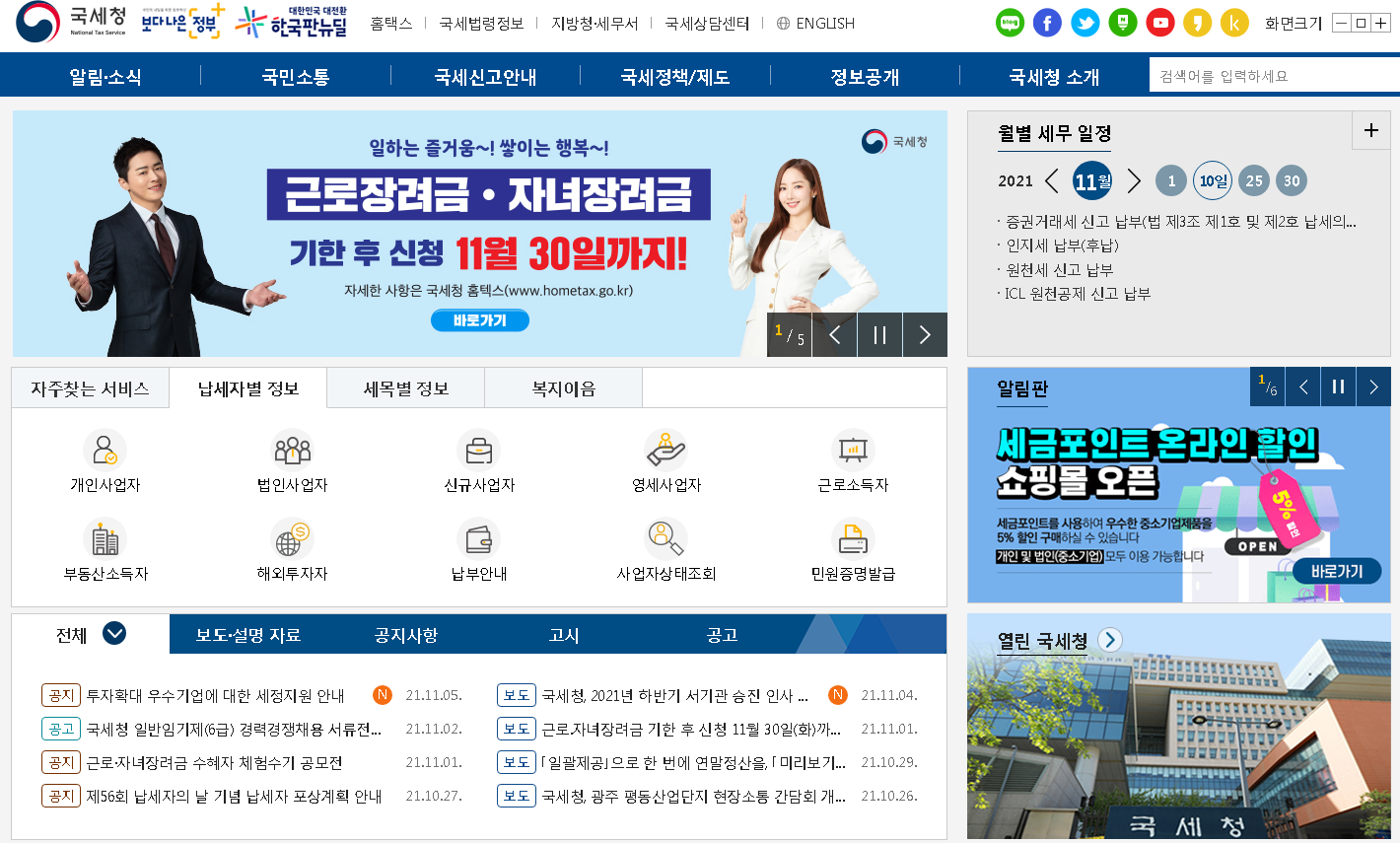 온라인으로 제공되는 기본 국세청 홈페이지에서는 알림, 국민소통, 국세신고안내, 국세정책/제도, 정보공개 등을 제공하고 있구요.