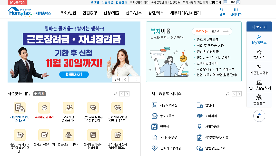 세금납부 같은 경우나 근로장려금 신청과 같은 업무는 온라인 홈텍스 홈페이지를 통하여 확인하고 업무 진행이 가능합니다.
