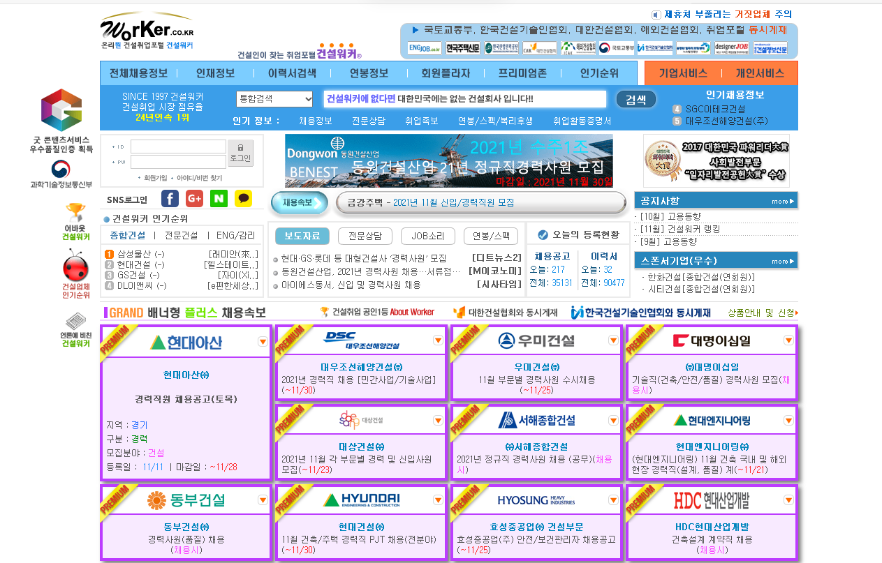 건설쪽에 업무를 진행하시는 분들이 일자리 정보를 얻기 좋은 사이트로 건설워커 홈페이지가 있습니다. 건설취업, 구인구직, 채용쪽에 대한 정보를 온라인으로 제공하고 있는데요.