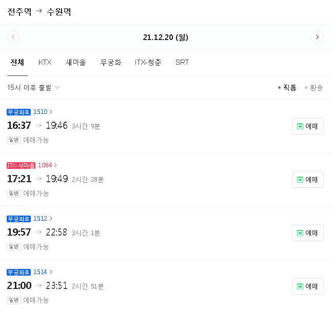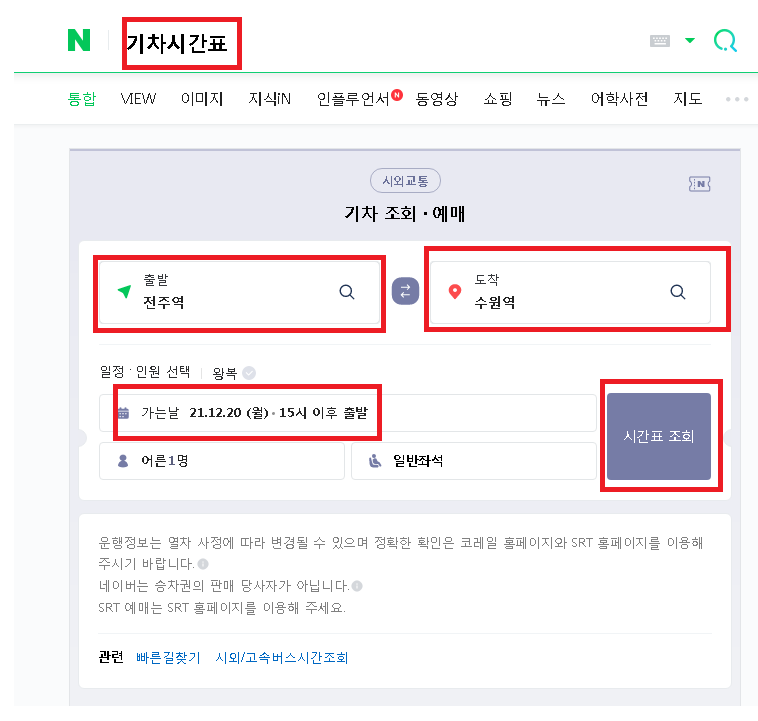 이용방법은 네이버 검색기능을 통하여 기차시간표를 조회하신 후에 출발지와 도착지에 각각 전주역과 수원역을 지정해두신 후에 시간표 조회를 해주시면 됩니다.