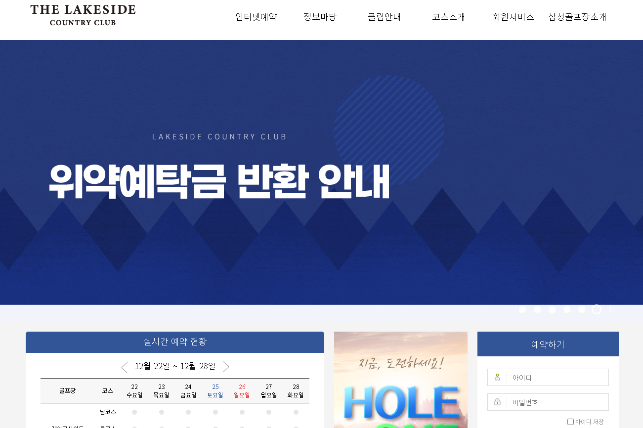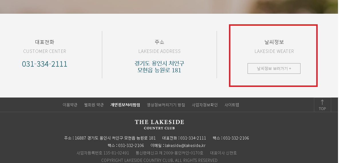 온라인 홈페이지의 하단에서는 날씨정보가 표시가 되어집니다. 여기에서 레이크사이드cc에 대한 날씨를 확인할 수 있게 제공이 되어집니다.