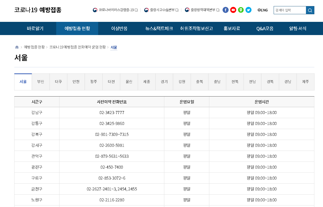 통합 콜센터 같은 경우는 질병관리청의 1339를 이용하시면 된다고 하구요. 이외에 코로나19 예방접종 전화예약는 지역별로 따로 운영이 되어지고 있습니다. 따라서 참고하시고 확인하시면 좋을 것 같습니다.